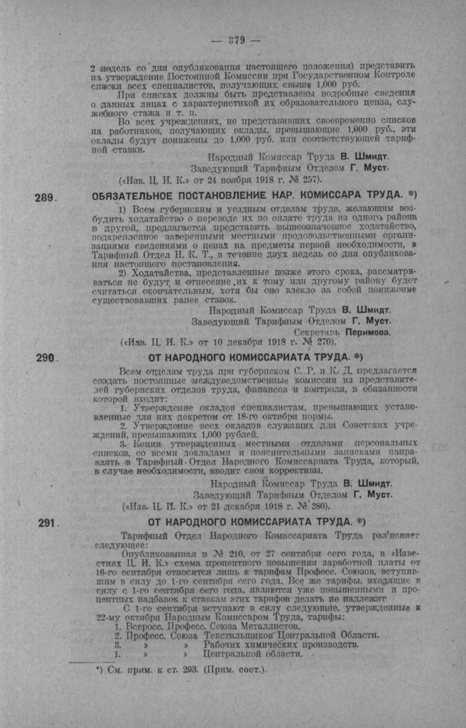 Обязательное постановление Народного Комиссара Труда о порядке возбуждения ходатайств о переводе ставок оплаты труда из одного района в другой // Известия Ц. И. К. от 10 декабря 1918 г. № 270.