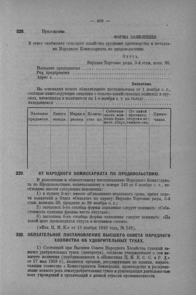 От Народного Комиссариата по Продовольствию. Дополнение к обязательному постановлению об учете с.-х. машин и орудий // Известия Ц. И. К. от 15 ноября 1918 года, № 249.