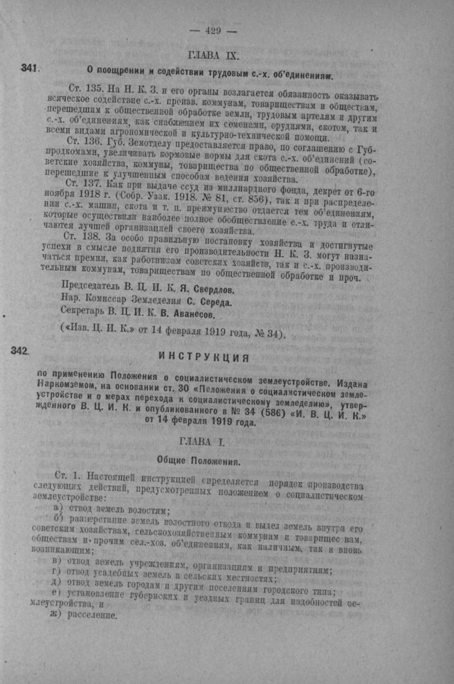 Инструкция по применению Положения о социалистическом землеустройстве. Издана Наркомземом, на основании ст. 30 «Положения о социалистическом землеустройстве и о мерах перехода к социалистическому земледелию», утвержденного В. Ц. И. К. и опубликованного в № 34 (586) «И. В. Ц. И. К.» от 14 февраля 1919 года.