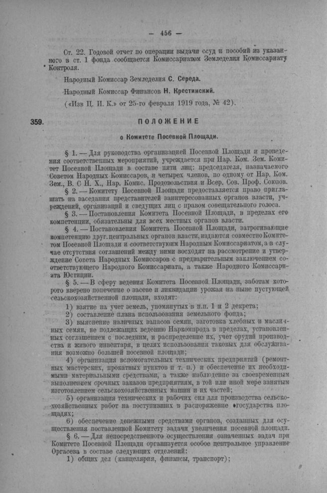 Положение о Комитете посевной площади. Москва, Кремль, 22-го февраля 1919 г. // Известия Ц. И. К. от 26-го февраля 1919 года, № 44.