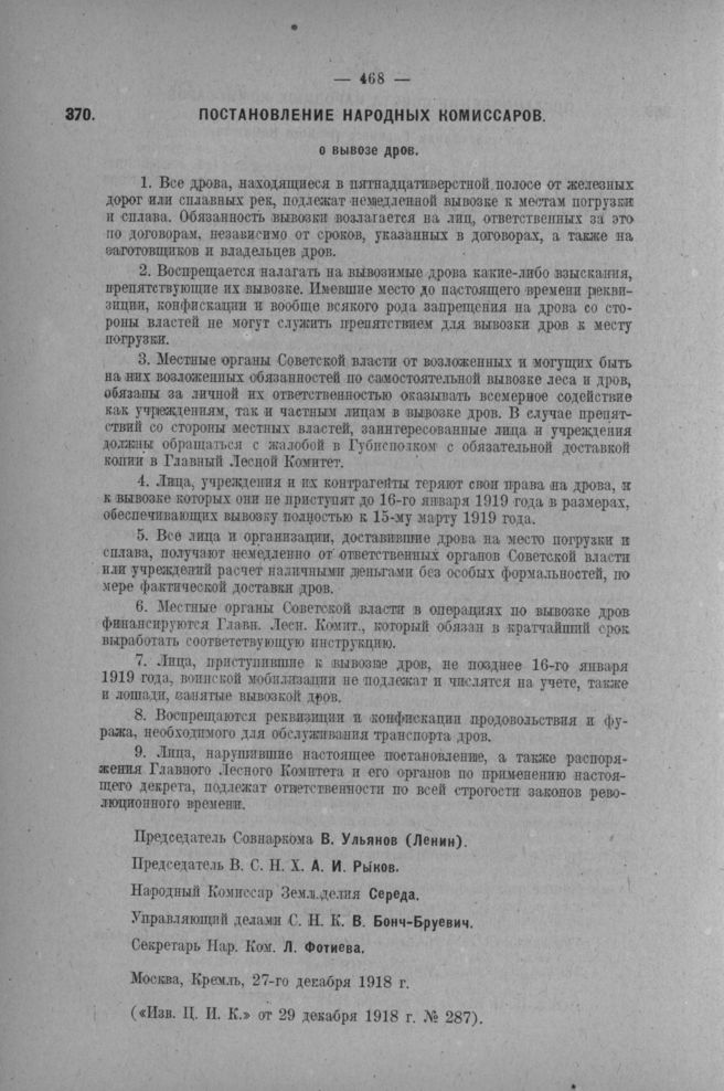Постановление Совета Народных Комиссаров о вывозе дров. Москва, Кремль, 27-го декабря 1918 г. // Известия Ц. И. К. от 29 декабря 1918 г. № 287.
