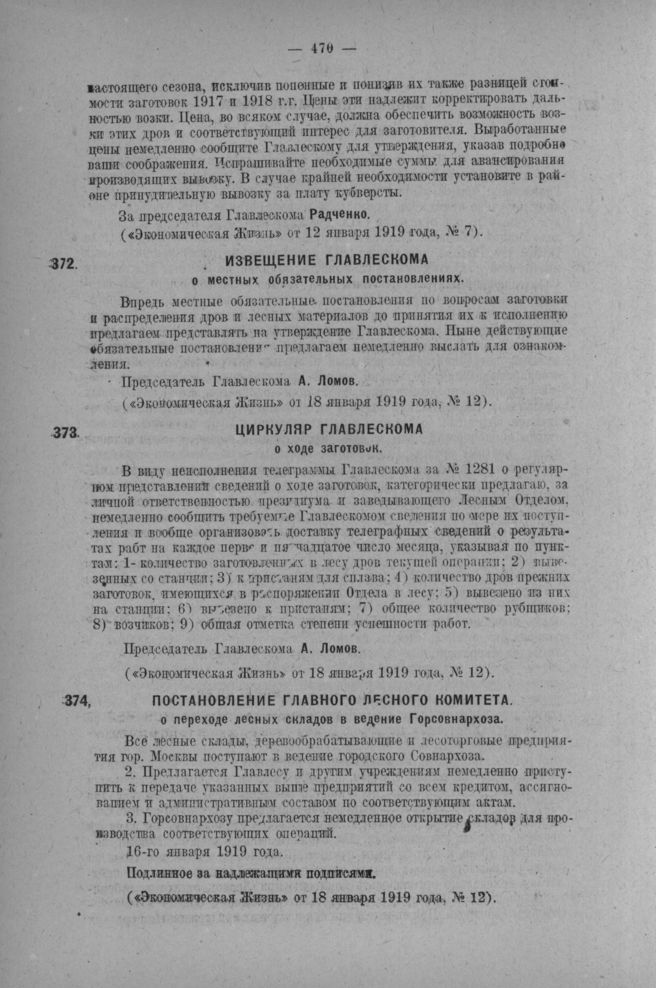 Циркуляр Главлескома о ходе заготовок // Экономическая Жизнь от 18 января 1919 года, № 12.