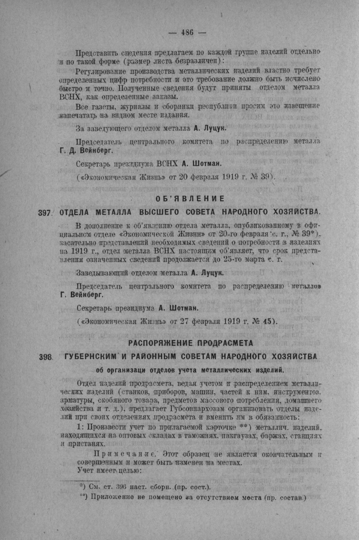 Распоряжение Продрасмета губернским и районным Советам Народного Хозяйства об организации отделов учета металлических изделий // Экономическая Жизнь от 21 февраля 1919 года. № 40.