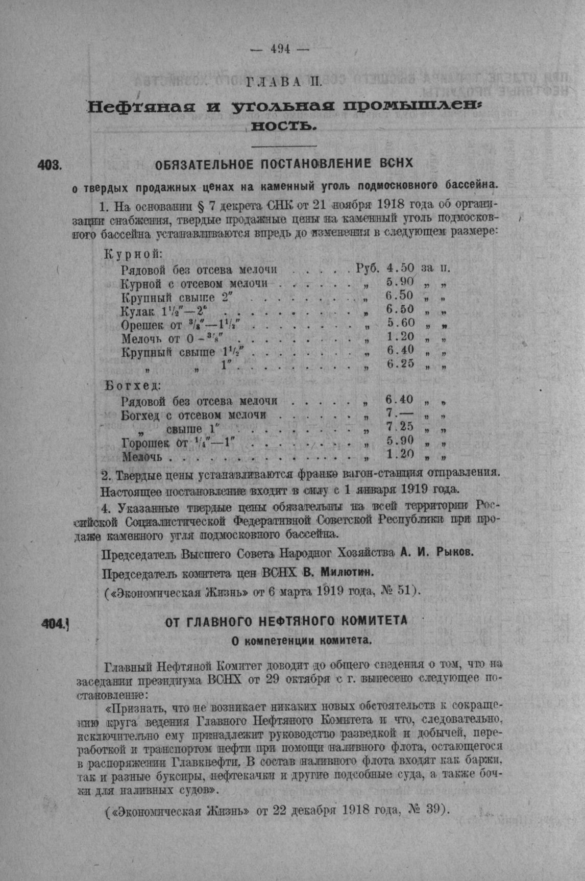 Обязательное постановление ВСНХ о твердых продажных ценах на каменный уголь подмосковного бассейна // Экономическая Жизнь от 6 марта 1919 года, № 51.