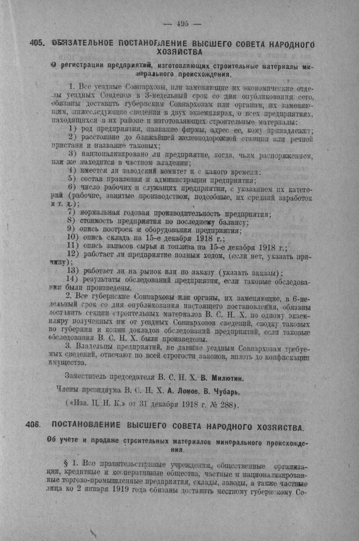 Обязательное постановление ВСНХ о регистрации предприятий, изготовляющих строительные материалы минерального происхождения // Известия Ц. И. К. от 31 декабря 1918 г. № 288.
