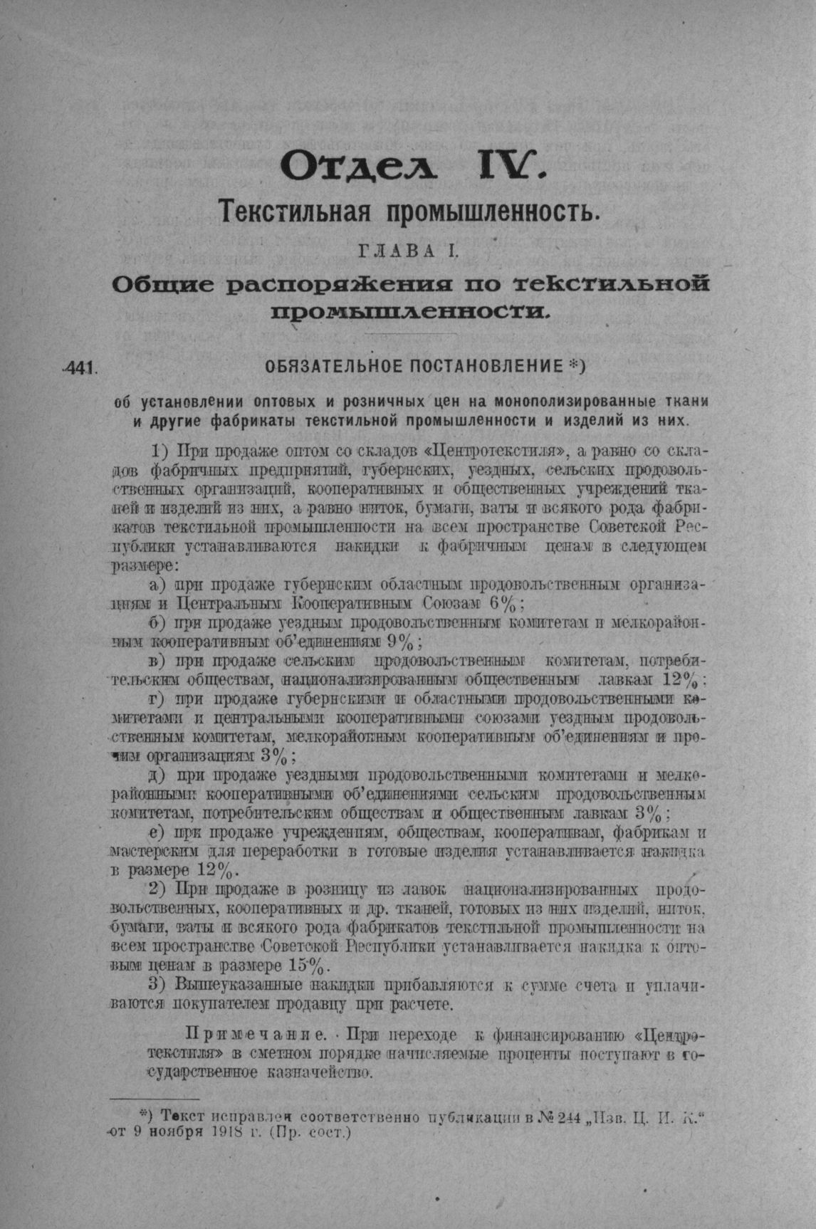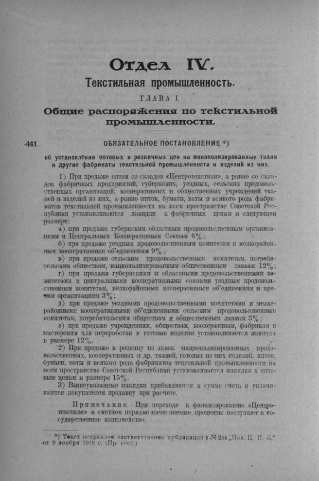 Обязательное постановление об установлении оптовых и розничных цен на монополизированные ткани и другие фабрикаты текстильной промышленности и изделий из них // Известия Ц. И. К. от 26 и 30 октября 1918 г., за №№ 234 и 237.