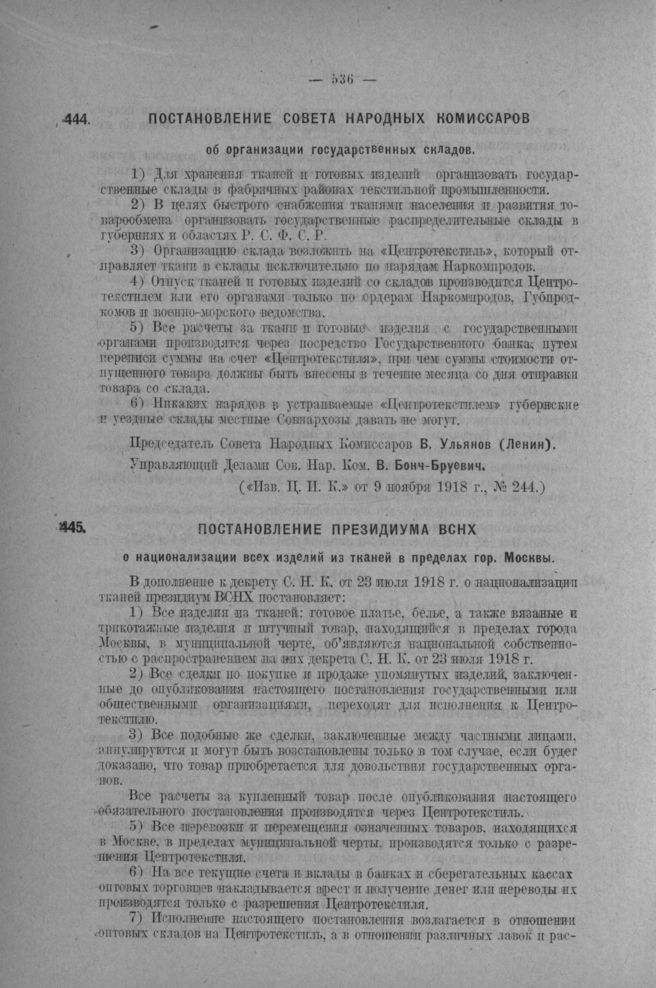 Постановление Президиума ВСНХ о национализации всех изделий из тканей в пределах г. Москвы // Экономическая Жизнь от 17 ноября 1918 г., № 9.