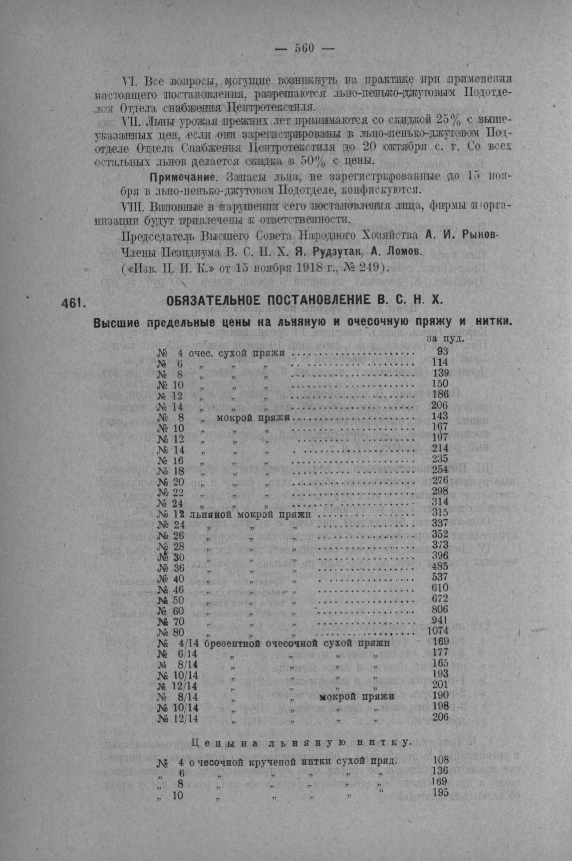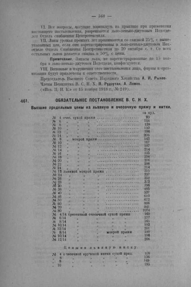 Обязательное постановление ВСНХ. Высшие предельные цены на льняную и очесочную пряжу и нитки // Экономическая Жизнь от 1 декабря 1918 г., № 21.