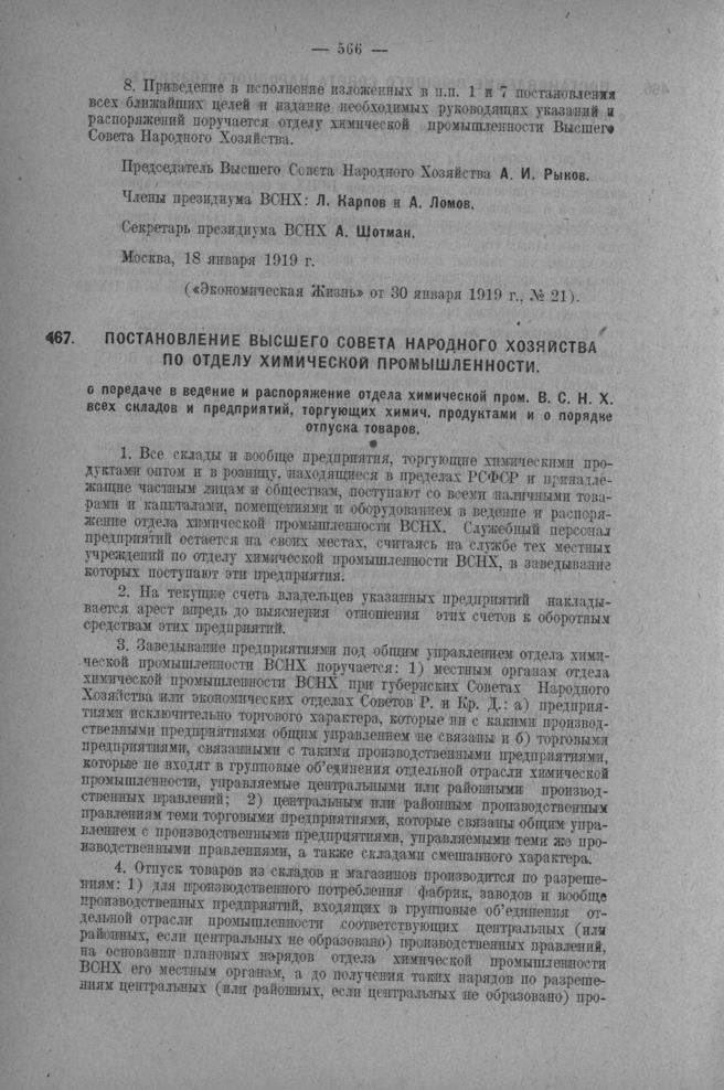 Постановление ВСНХ по Отделу химической промышленности о передаче в ведение и распоряжение Отдела химической пром. ВСЕХ всех складов и предприятий, торгующих химическими продуктами и о порядке отпуска товаров. Москва, 1-го марта 1919 г. // Экономическая Жизнь от 2 марта 1919 г., № 48.