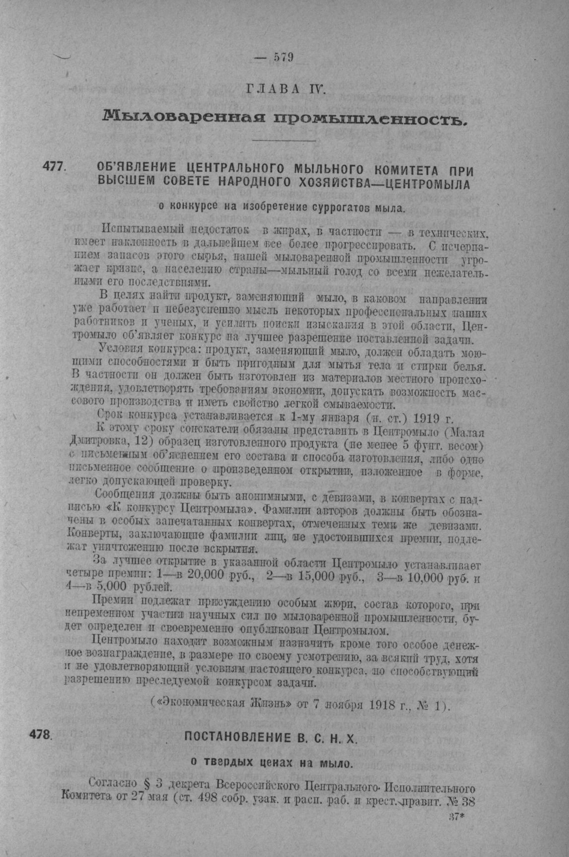 Постановление ВСНХ о твердых ценах на мыло // Экономическая Жизнь от 28 ноября 1918 г., № 18.