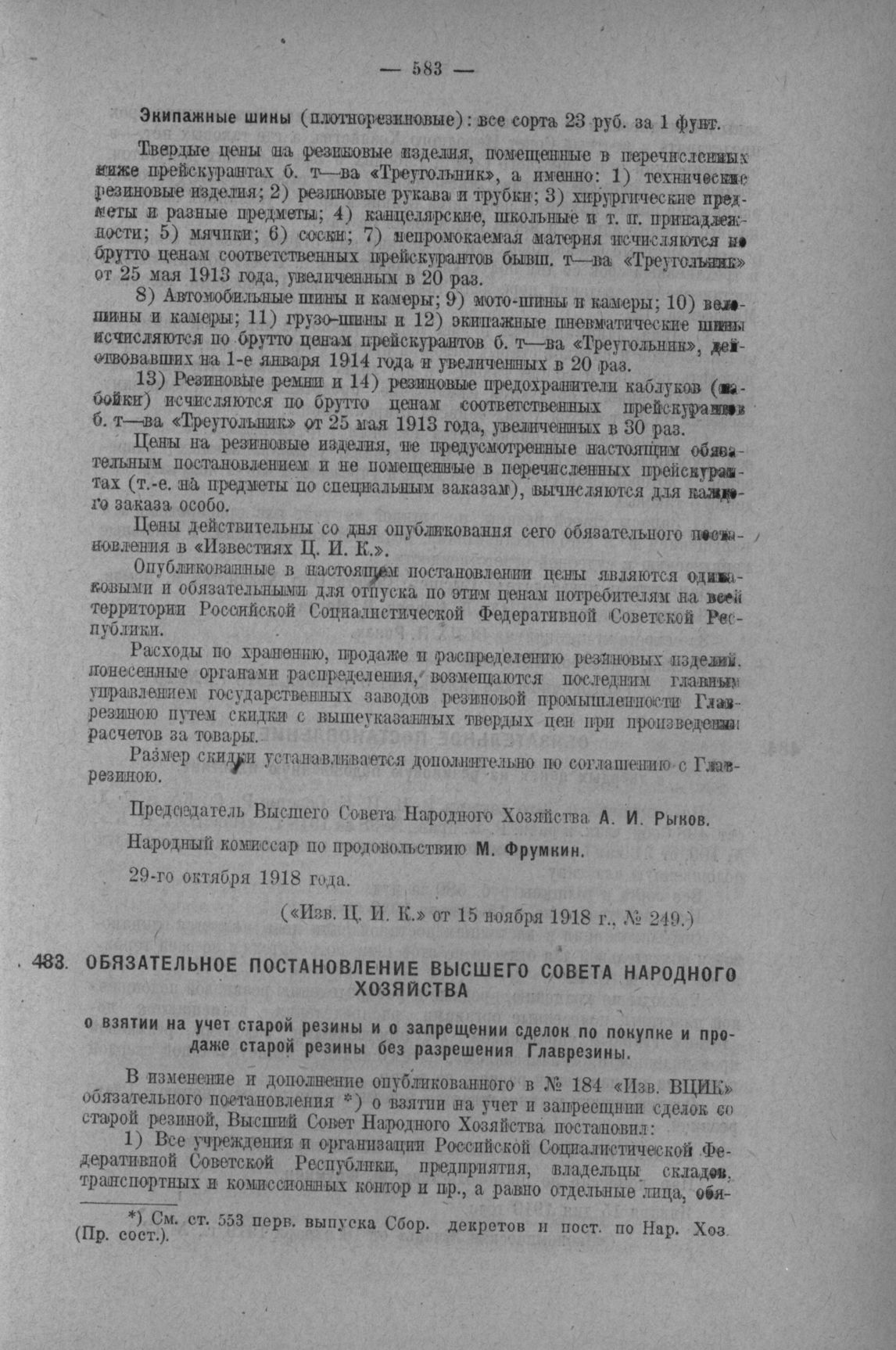 Обязательное постановление ВСНХ о взятии на учет старой резины и о запрещении сделок по покупке и продаже старой резины без разрешения Главрезины. Москва, 5 декабря 1918 г. // Экономическая Жизнь от 6 декабря 1918 г., № 25.