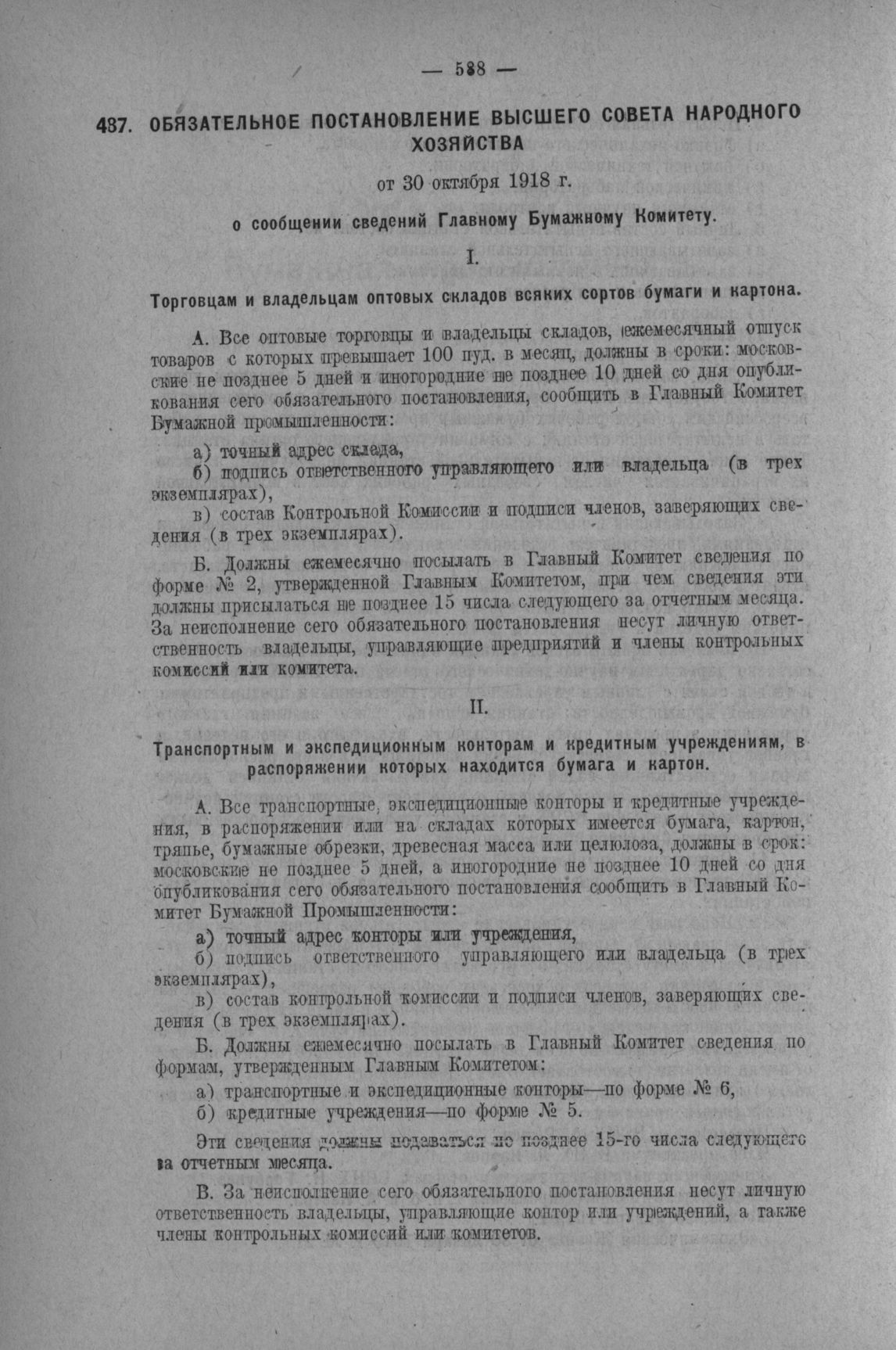 Обязательное постановление ВСНХ от 30 окт. 1918 г. о сообщении сведений Главному Бумажному Комитету. Москва, 30 октября 1918 г. // Известия Ц. И. К. от 15 ноября 1918 г. № 241.