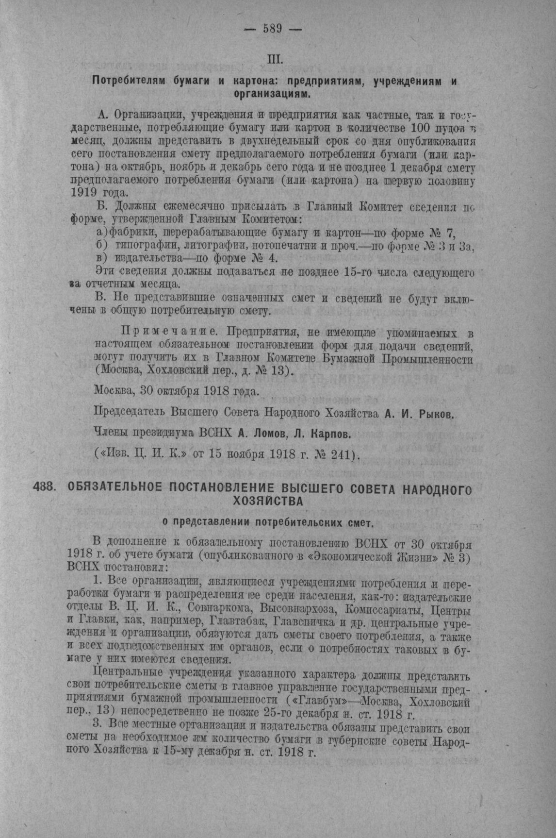 Обязательное постановление ВСНХ о представлении потребительских смет // Известия Ц. И. К. от 10 декабря 1918 г. № 270.