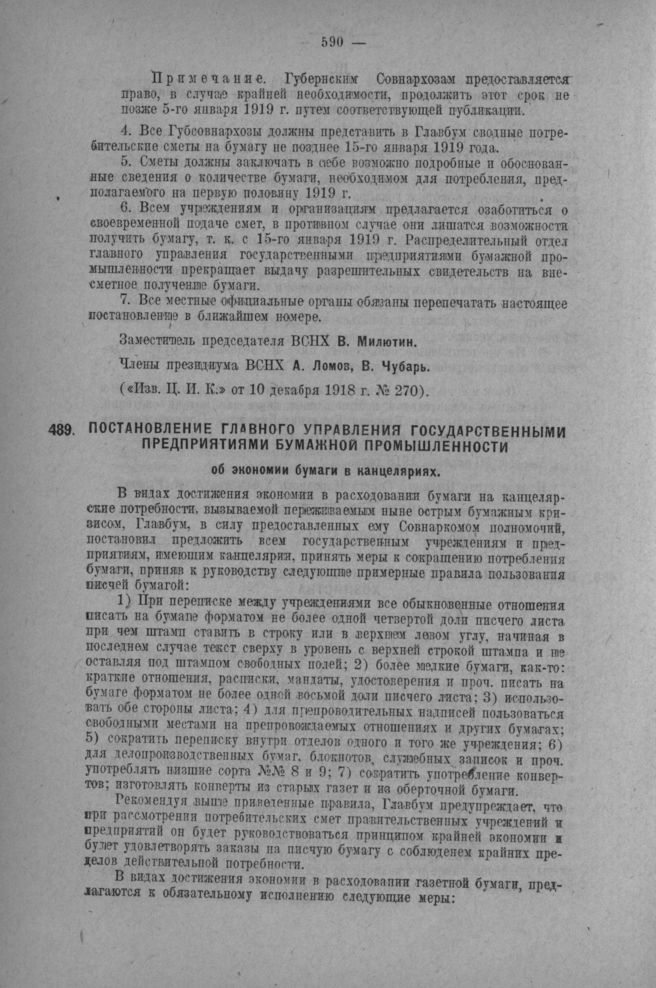 Постановление Главного Управления государственными предприятиями бумажной промышленности об экономии бумаги в канцеляриях // Известия Ц. И. К. от 16 января 1919 года, № 10.