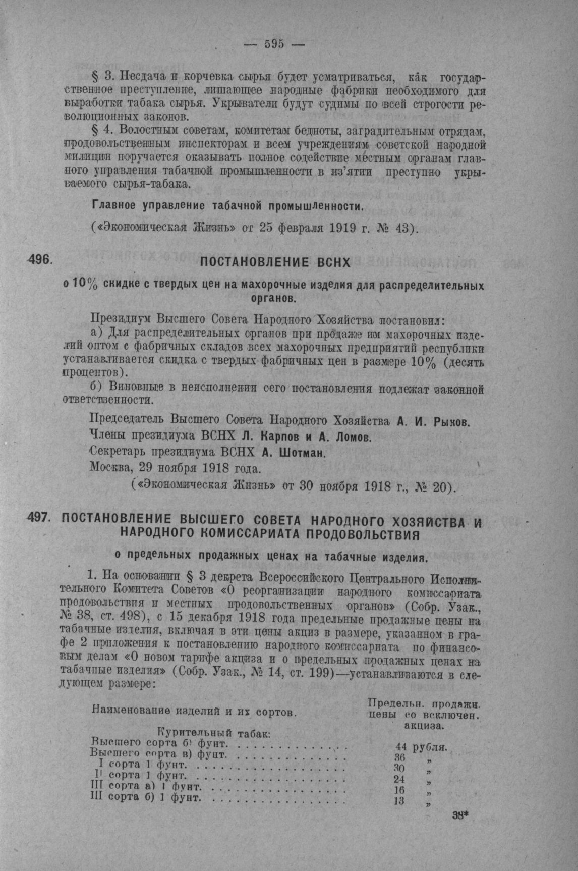 Постановление ВСНХ о 10% скидке с твердых цен на махорочные изделия для распределительных органов. Москва, 29 ноября 1918 г. // Экономическая Жизнь от 30 ноября 1918 г., № 20.