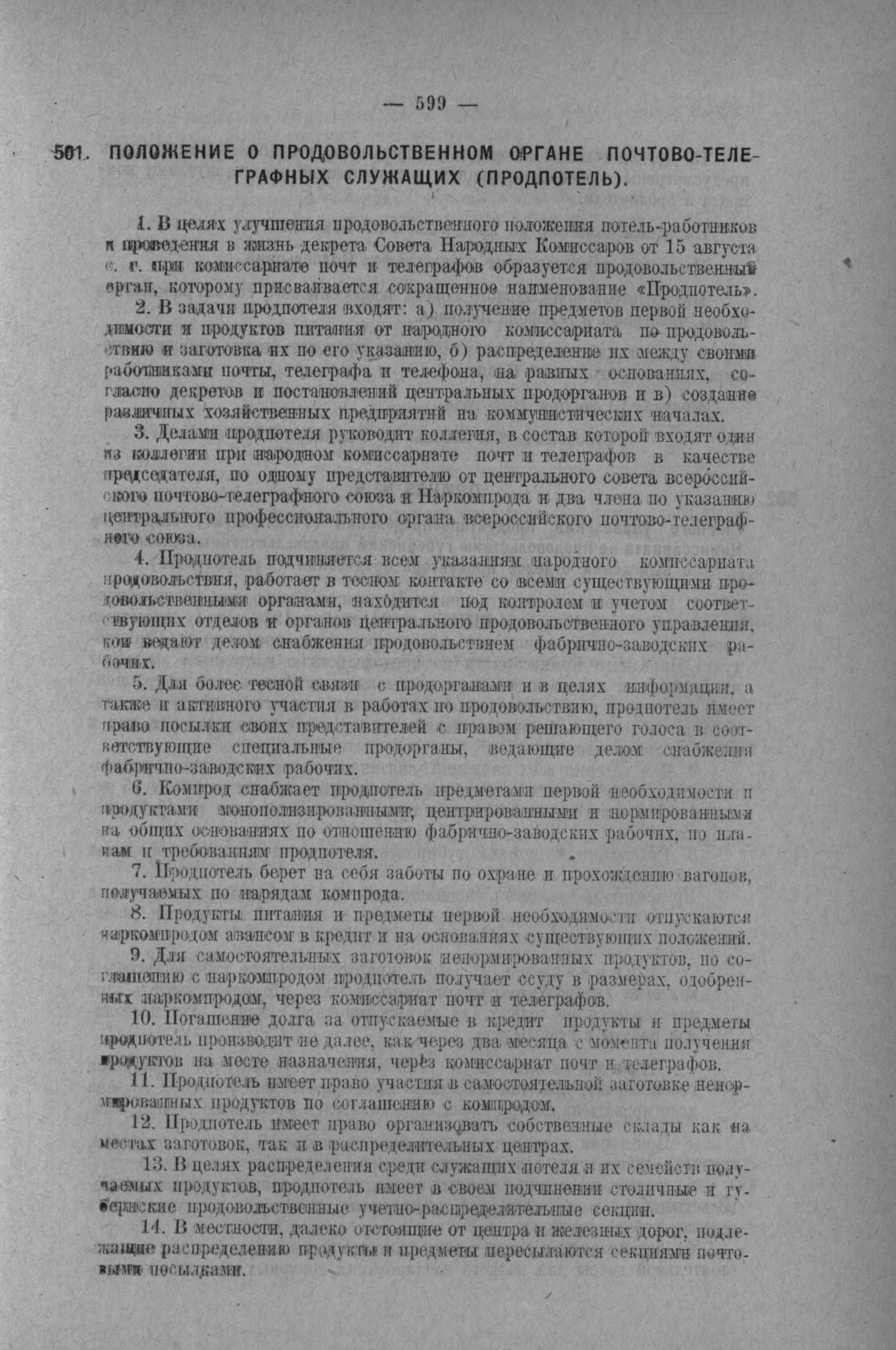 Положение о продовольственном органе почтово-телеграфных служащих (Продпотель). Москва, 13 ноября 1918 г. // Экономическая Жизнь от 5 декабря 1918 г., № 24.