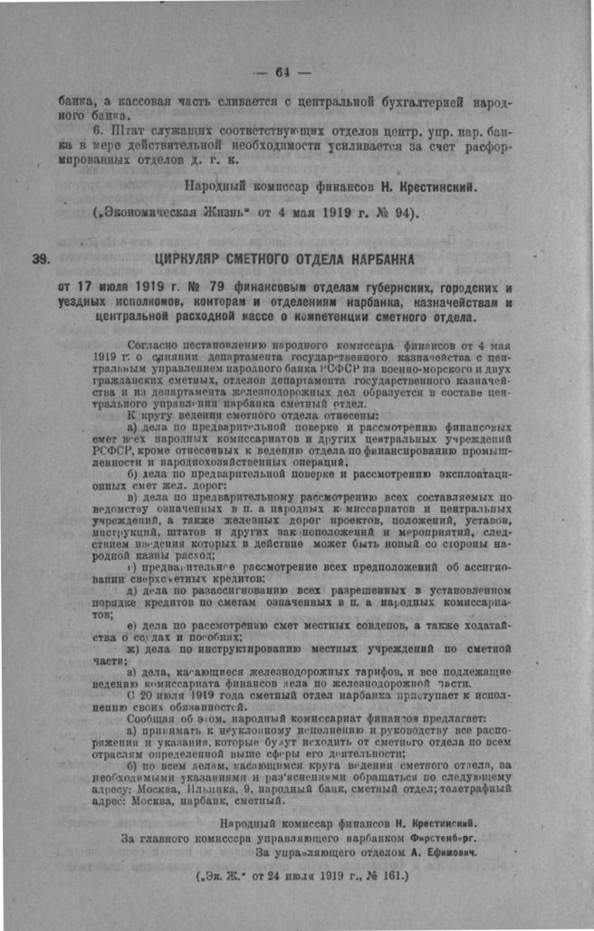 Циркуляр сметного отдела Нарбанка от 17 июля 1919 г. № 79 финансовым отделам губернских, городских и уездных исполкомов, конторам и отделениям Нарбанка, казначействам и центральной расходной кассе о компетенции сметного отдела // «Экономическая Жизнь» от 24 июля 1919 г., № 161.