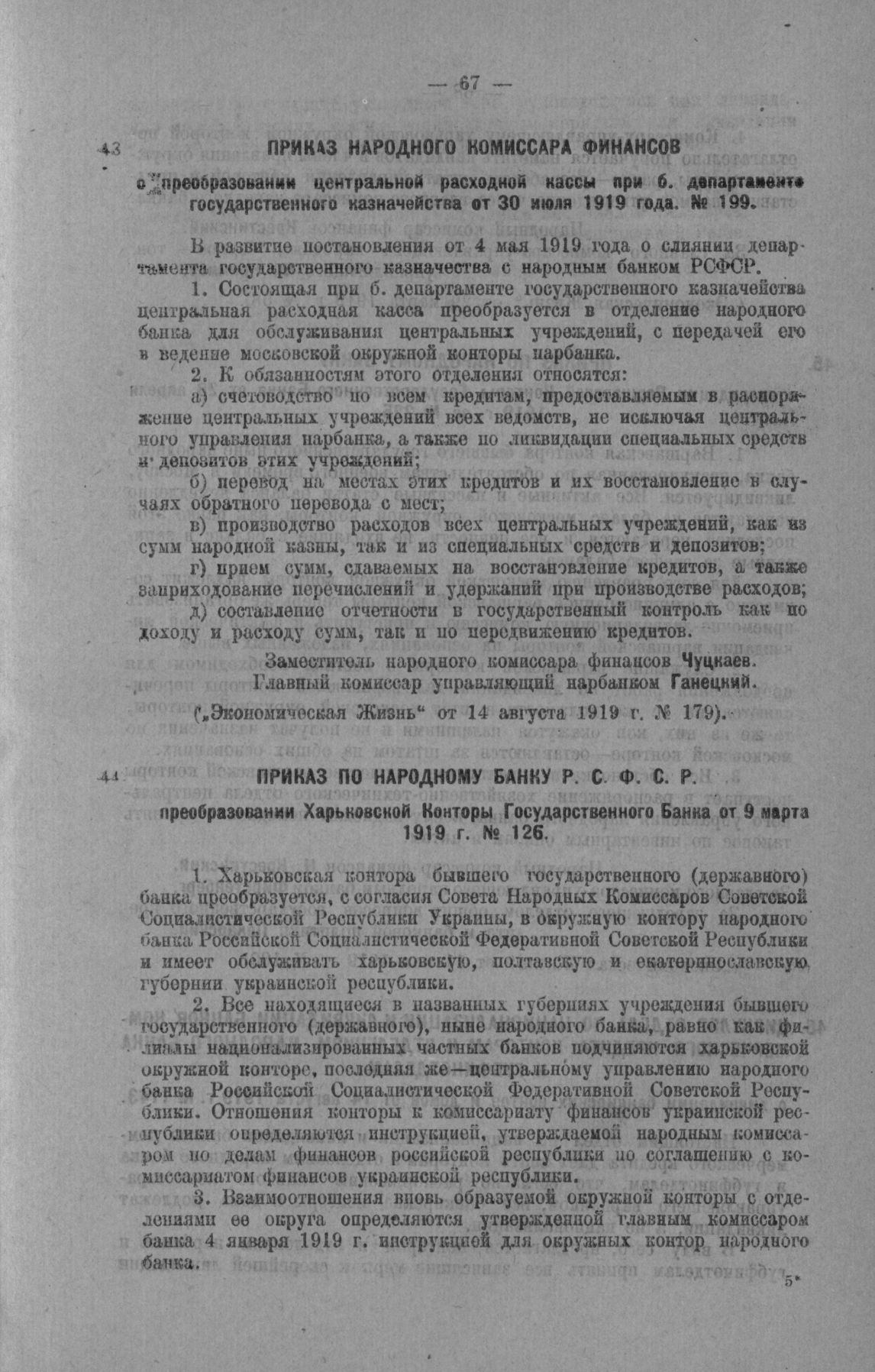 Приказ Народного Комиссара финансов о преобразовании Центральной расходной кассы при б. Департаменте Государственного Казначейства от 30 июля 1919 года. № 199 // «Экономическая Жизнь» от 14 августа 1919 г. № 179.