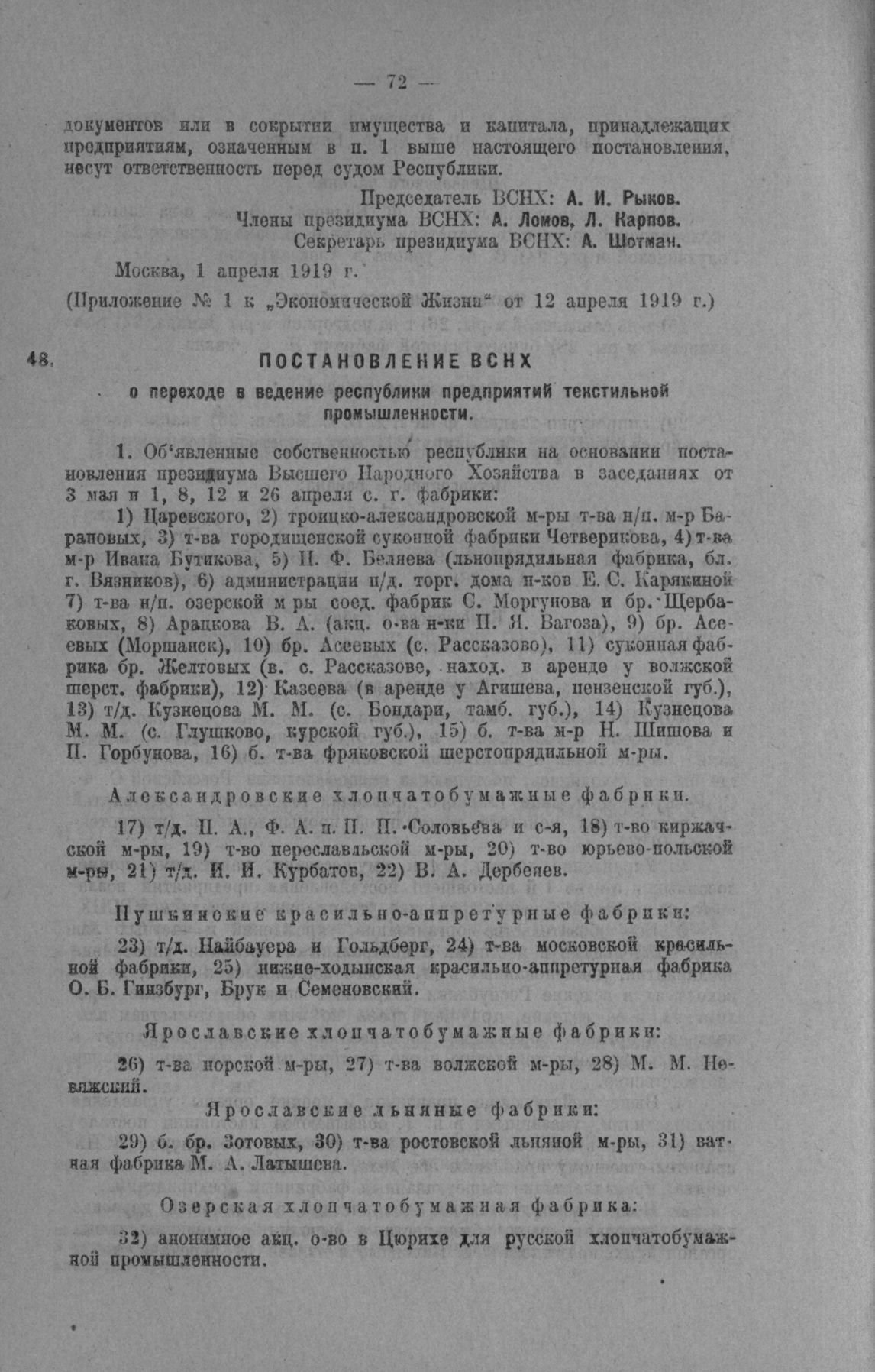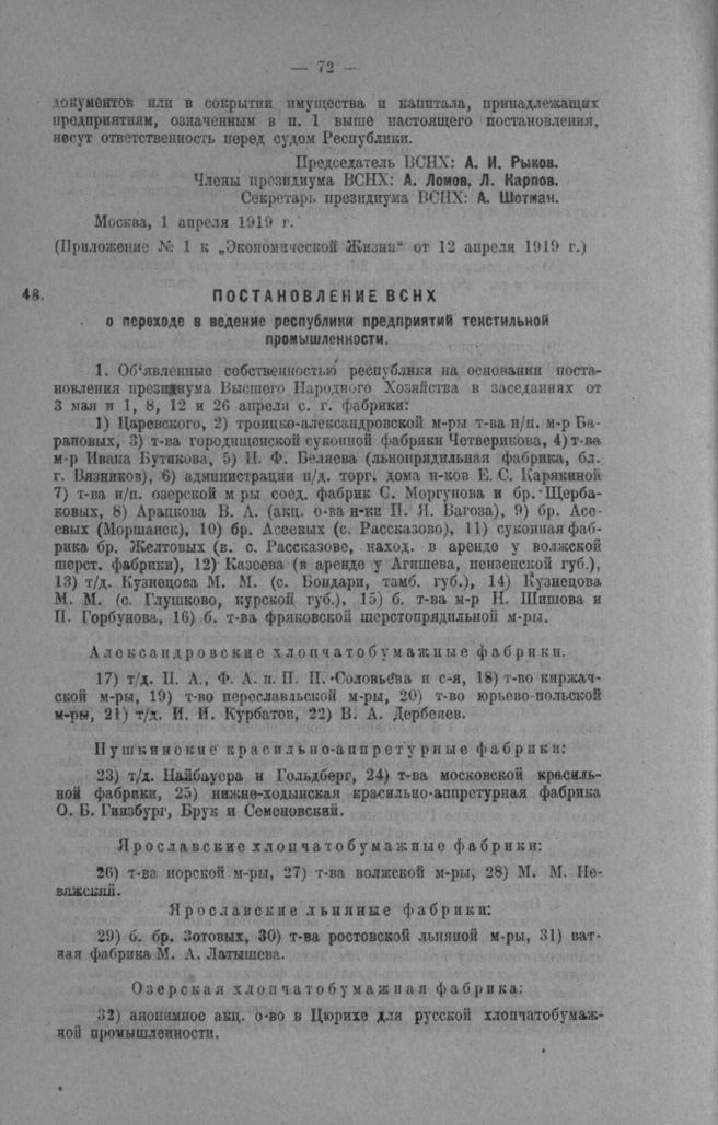 Постановление ВСНХ о переходе в ведение Республики предприятий текстильной промышленности [1] // Приложение № 5 к «Экономической Жизни» от 25 Мая 1919 г.