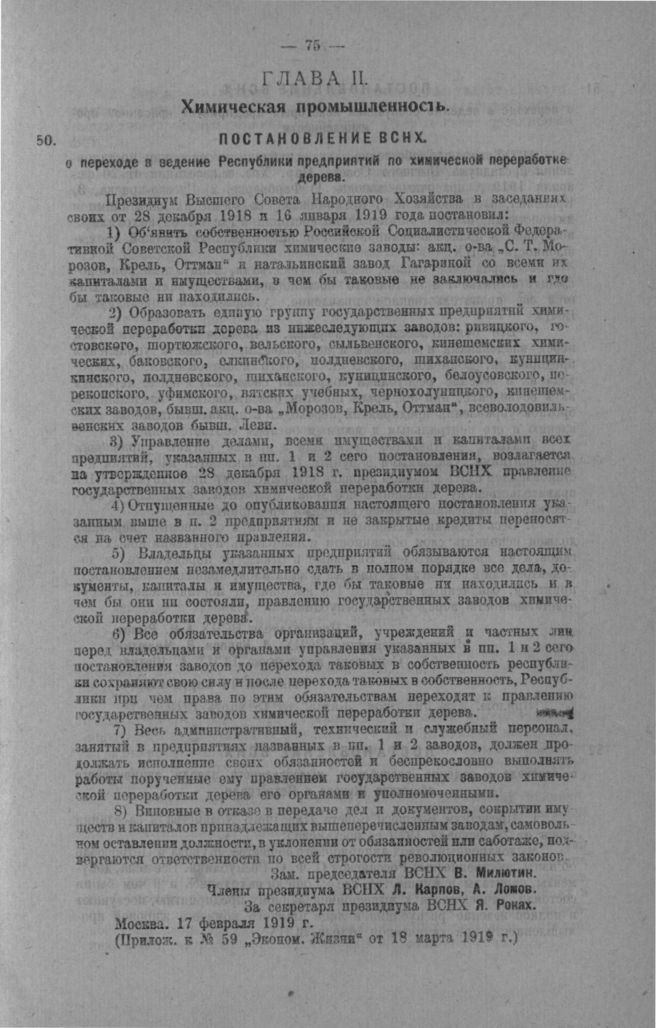 Постановление ВСНХ о переходе а ведение Республики предприятий по химической переработке дерева. Москва. 17 февраля 1919 г. // Приложение к № 59 «Экономической Жизни» от 18 марта 1919 г.