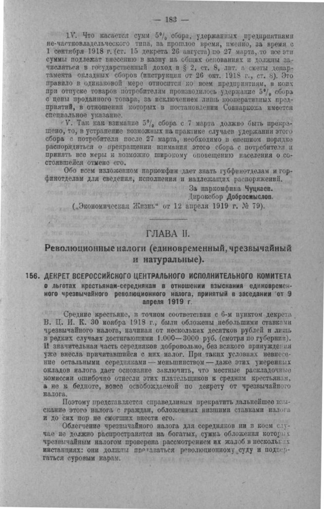 Декрет Всероссийского Центрального Исполнительного Комитета о льготах крестьянам-середнякам в отношении взыскания единовременного чрезвычайного революционного налога, принятый в заседании от 9 апреля 1919 г. // «Экономическая Жизнь» от 11 апреля 1919 г., № 78.