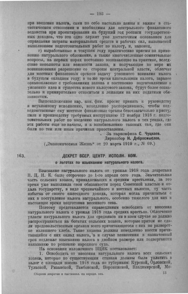 Декрет Всероссийского Центрального Исполнительного Комитета о льготах по взысканию натурального налога // «Изв. Ц. И. К.» от 26 апреля 1919 г., № 88.
