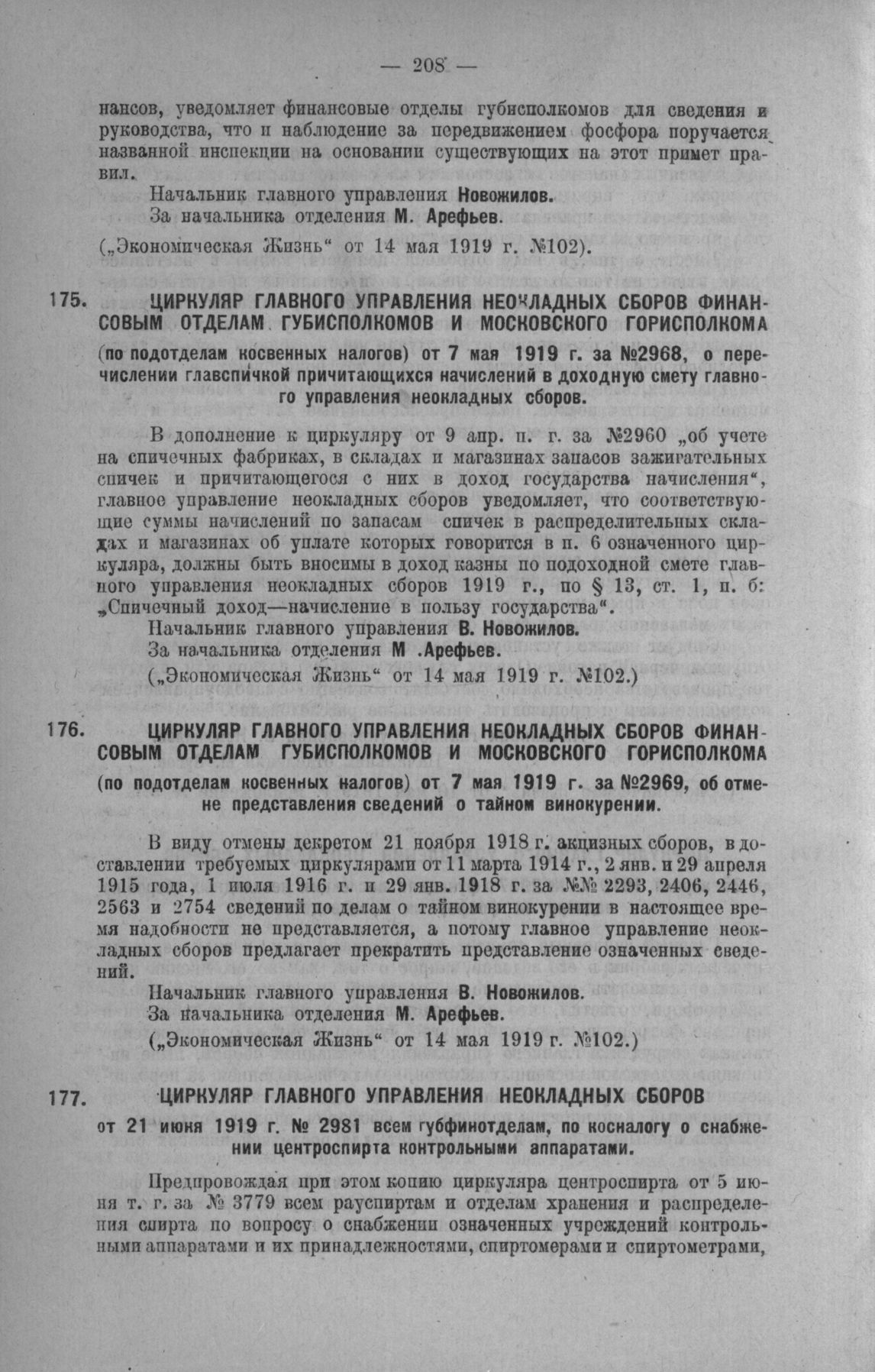 Циркуляр Главного Управления неокладных сборов финансовым отделам губисполкомов и Московского горисполкома (по подотделам косвенных налогов) от 7 мая 1919 г. за № 2968, о перечислении Главспичкой причитающихся начислений в доходную смету главного управления неокладных сборов // «Экономическая Жизнь» от 14 мая 1919 г. №102.