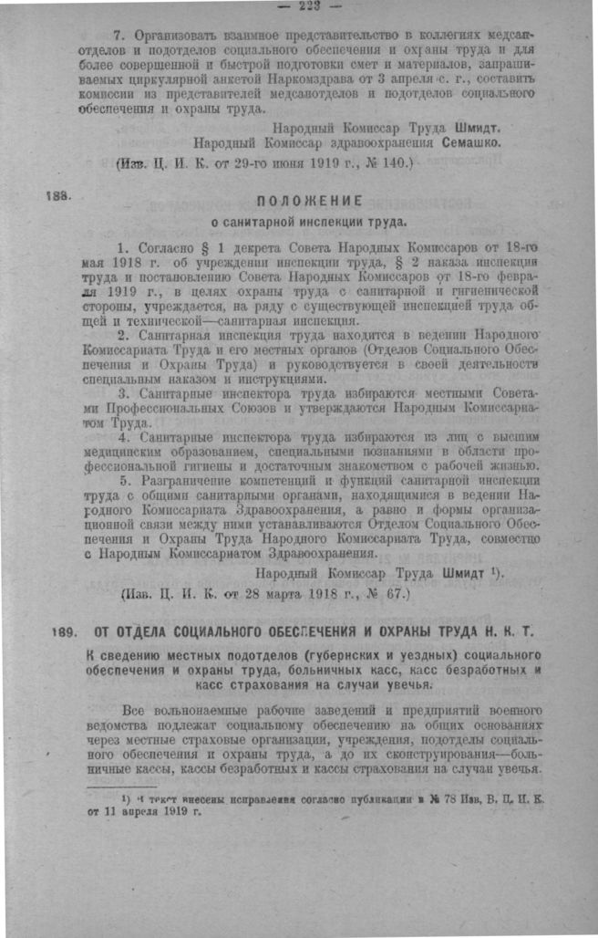Положение о санитарной инспекции труда // «Изв. Ц. И. К.» от 28 марта 1918 г., № 67.