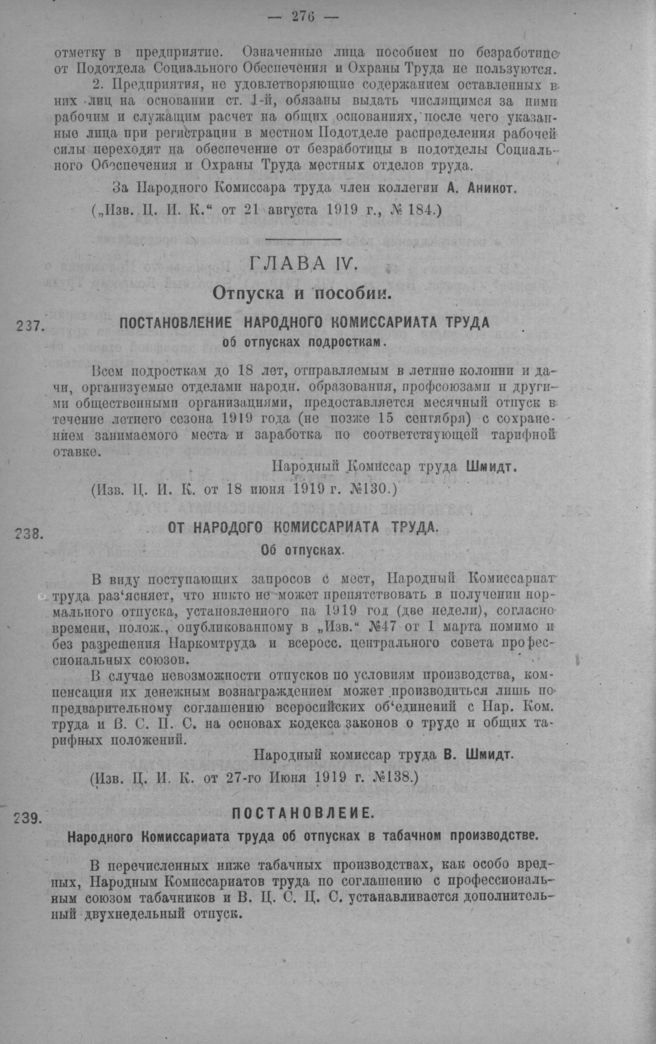 Постановление Народного Комиссариата труда об отпусках в табачном производстве // «Изв. Ц. И. К.» от 8 июля 1919 г. № 147.