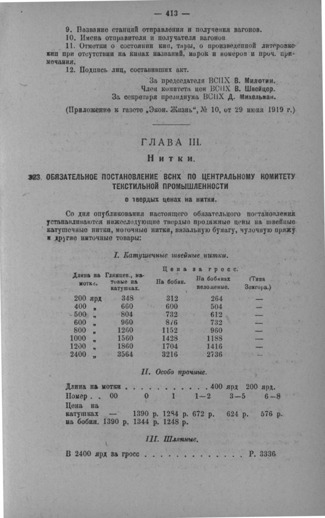 Обязательное постановление ВСНХ по Центральному Комитету текстильной промышленности о твердых ценах на нитки // Приложение № 2 к «Экономической Жизни» от 4 мая 1919 г.