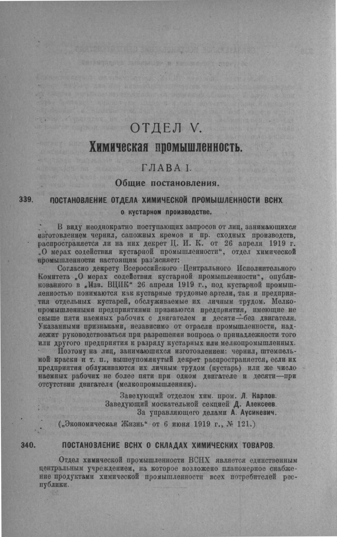Постановление ВСНХ о складах химических товаров // «Экономическая Жизнь» от 7-го июня 1919 г., № 122.
