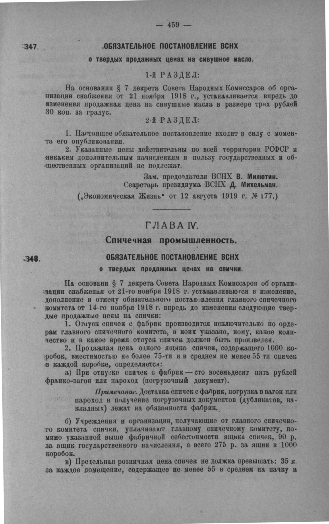 Обязательное постановление ВСНХ о твердых продажных ценах на спички // «Экономическая Жизнь» от 11 апреля 1919 г. № 78.