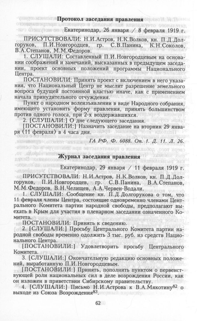 Всероссийский Национальный Центр. Журнал заседания Правления. Екатеринодар, 29 января / 11 февраля 1919 г.