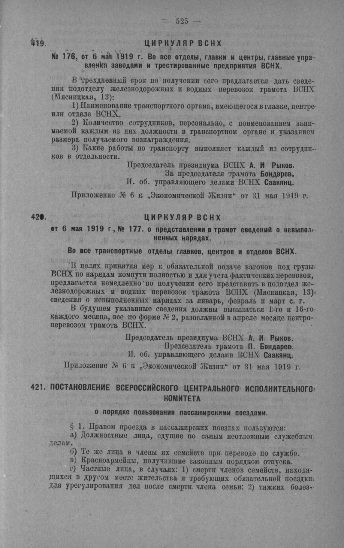 Циркуляр ВСНХ № 176, от 6 мая 1919 г. Во все отделы, главки и центры, главные управления заводами и трестированные предприятия ВСНХ // Приложение № 6 к «Экономической Жизни» от 31 мая 1919 г.