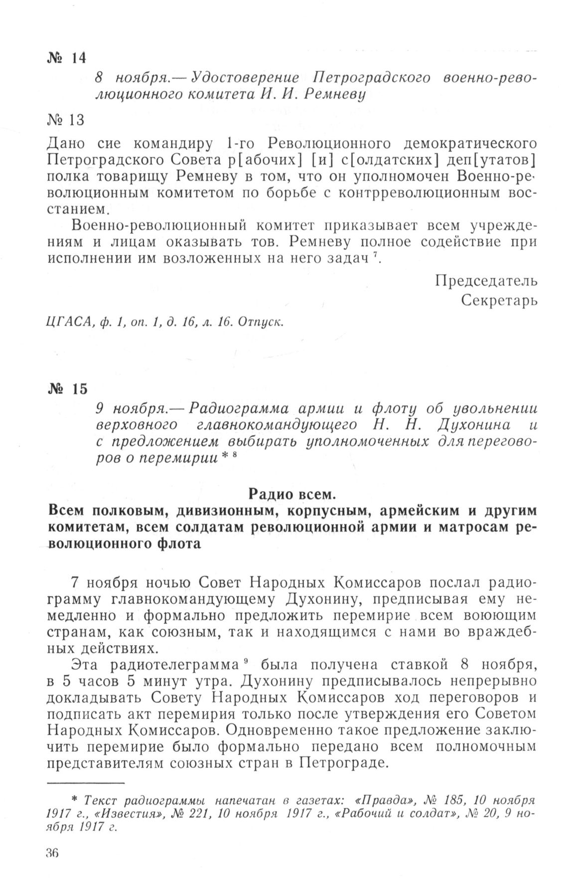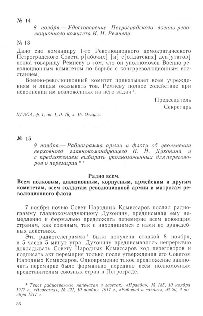 Радиограмма армии и флоту об увольнении верховного главнокомандующего Н. Н. Духонина и с предложением выбирать уполномоченных для переговоров о перемирии. 9 ноября 1917 г. // Ленин В. И. Полн. собр. соч., т. 35, с. 81—82.