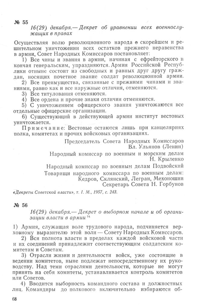 Декрет об уравнении всех военнослужащих в правах. 16(29) декабря 1917 г. // «Декреты. Советской власти», т. 1. М., 1957, с. 243.