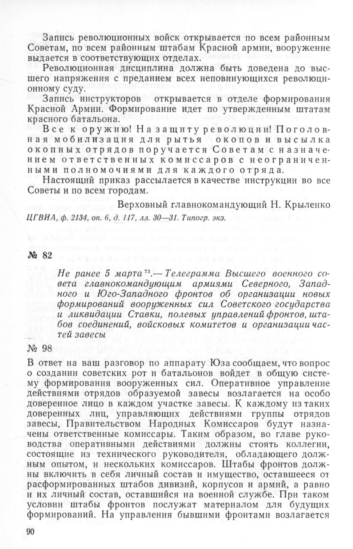 Телеграмма Высшего военного совета главнокомандующим армиями Северного, Западного и Юго-Западного фронтов об организации новых формирований вооруженных сил Советского государства и ликвидации Ставки, полевых управлений фронтов, штабов соединений, войсковых комитетов и организации частей завесы. Не ранее 5 марта 1918 г. // ЦГАСА, ф. 3, оп. 1, д. 78, лл. 134 об.— 135 об. Телегр. лента.
