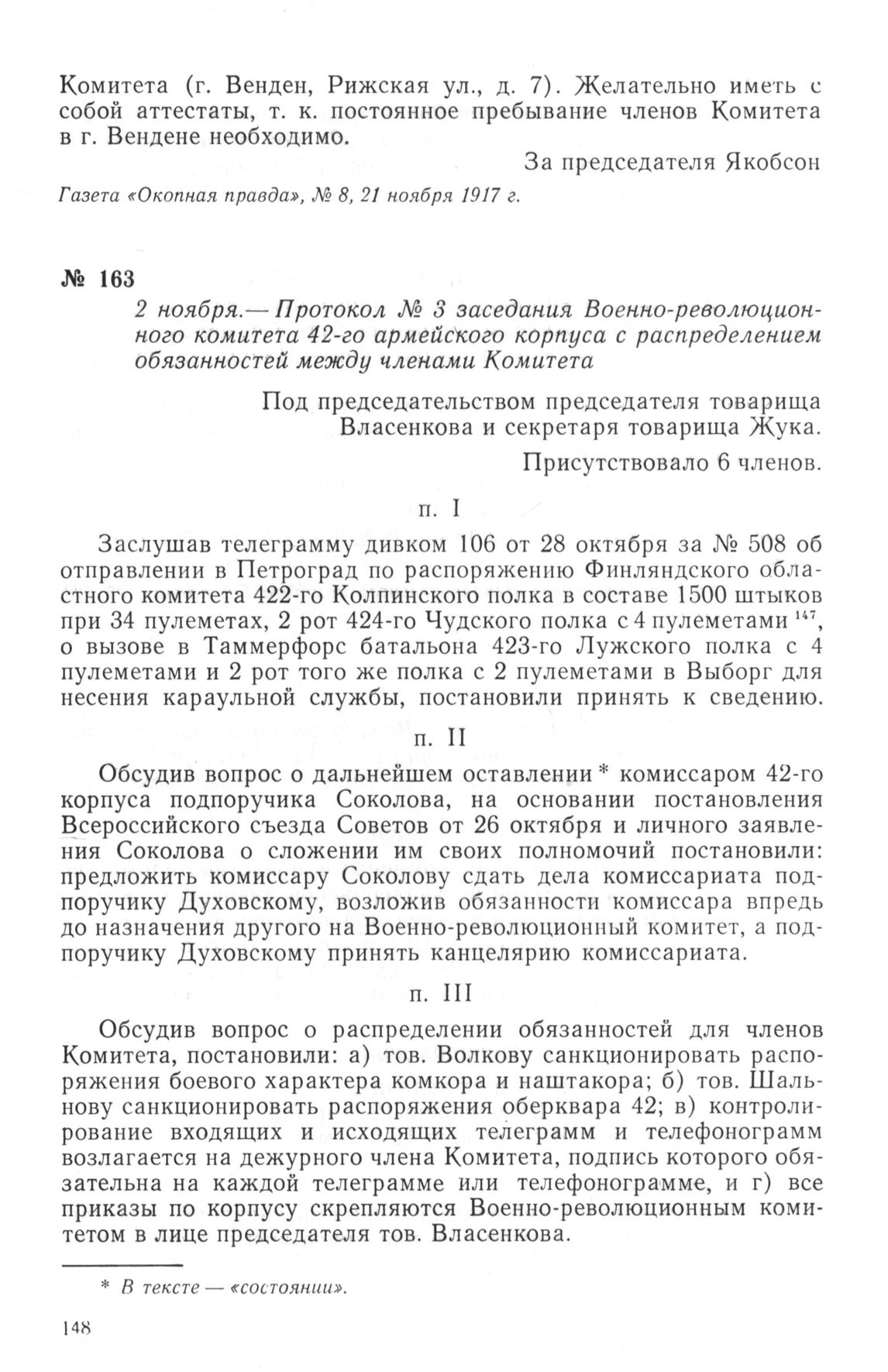 Протокол № 3 заседания Военно-революционного комитета 42-го армейского корпуса с распределением обязанностей между членами Комитета. 2 ноября 1917 г. // ЦГВИА, ф. 5009, оп. 1, д. 104, л. 59 об. Типогр. экз.