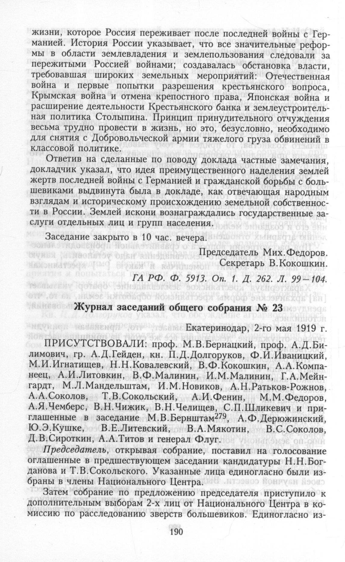 Всероссийский Национальный Центр. Журнал заседаний общего собрания № 23. Екатеринодар, 2-го мая 1919 г. // ГА РФ. Ф. 5913. Оп. 1. Д. 262. Л. 195-109 об.