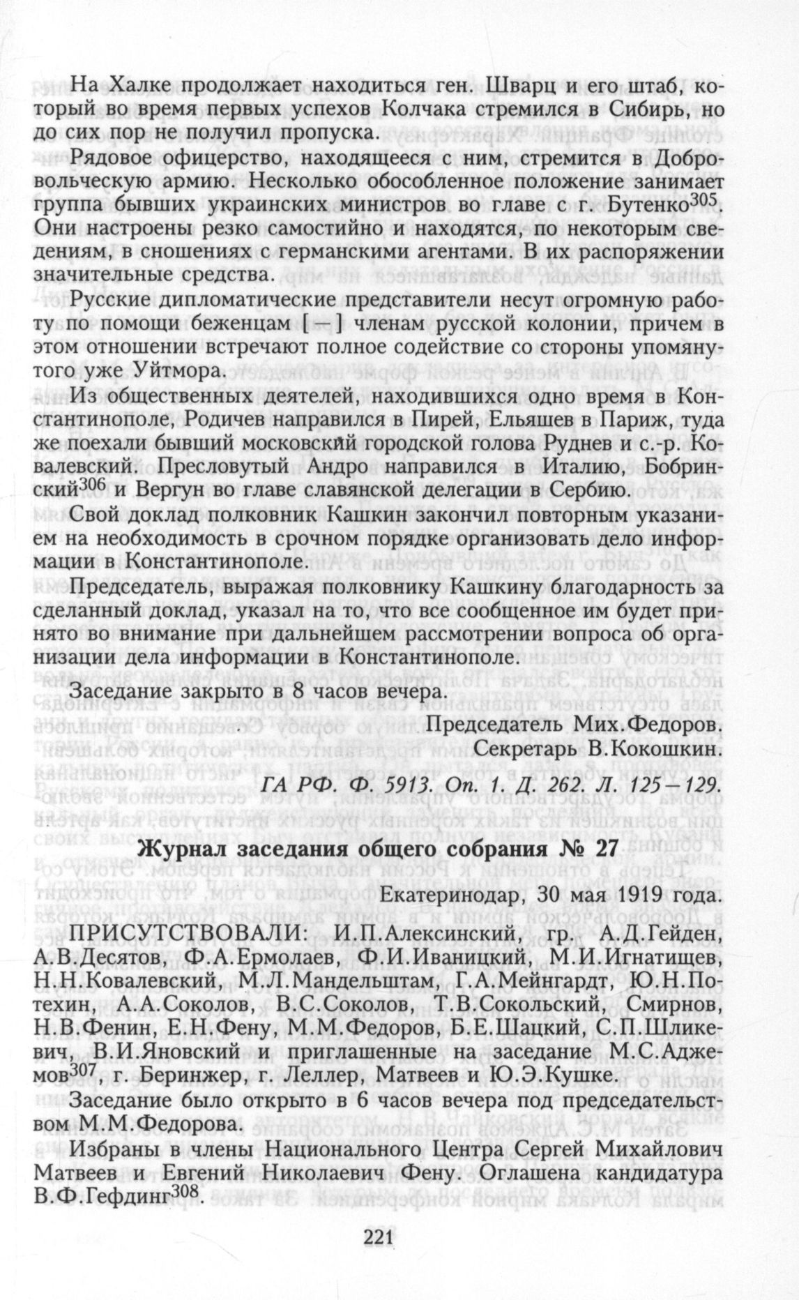 Всероссийский Национальный Центр. Журнал заседания общего собрания № 27. Екатеринодар, 30 мая 1919 года // ГА РФ. Ф. 5913. Оп. 1. Д. 262. Л. 115-117.
