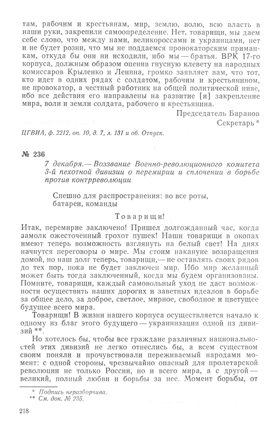 Воззвание Военно-революционного комитета 3-й пехотной дивизии о перемирии и сплочении в борьбе против контрреволюции. 7 декабря 1917 г.