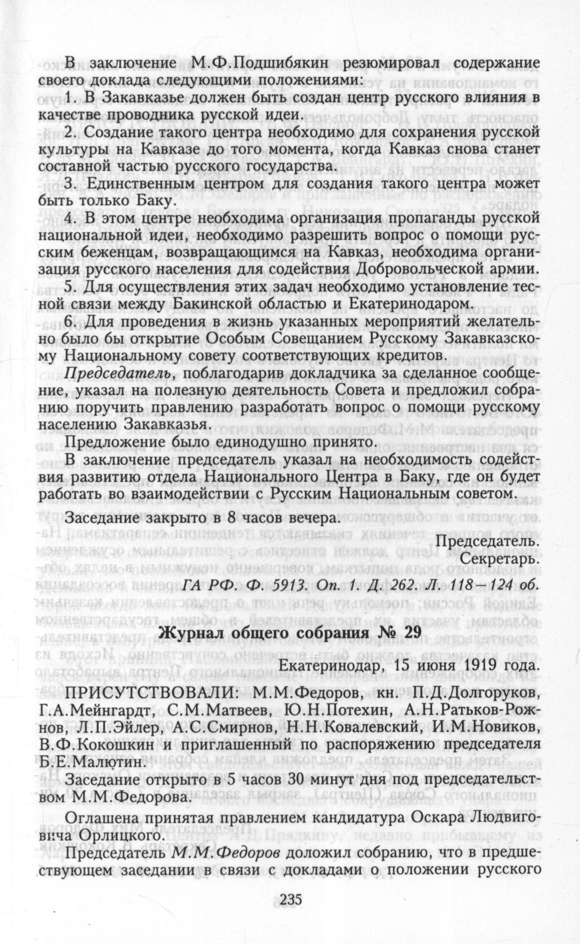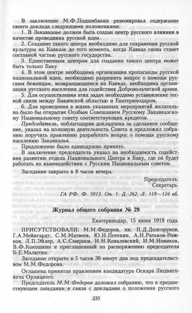 Всероссийский Национальный Центр. Журнал общего собрания № 29. Екатеринодар, 15 июня 1919 года