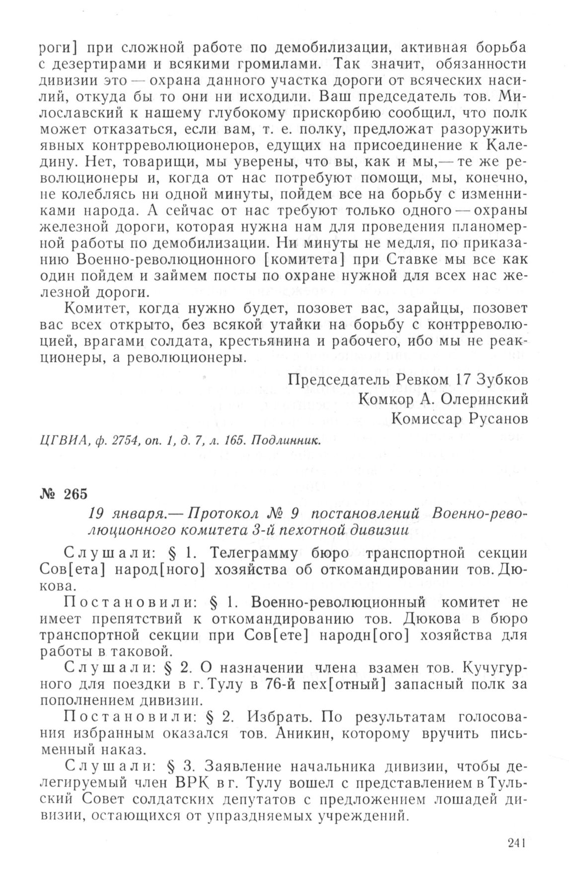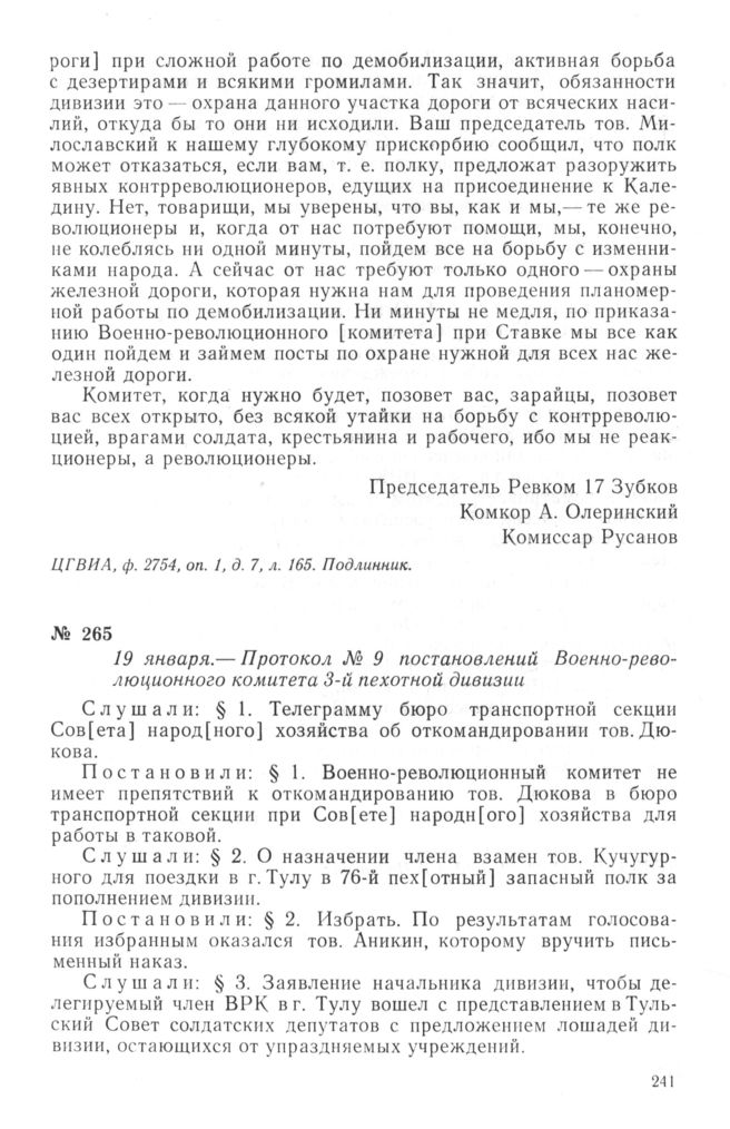 Протокол № 9 постановлений Военно-революционного комитета 3-й пехотной дивизии. 19 января 1918 г.