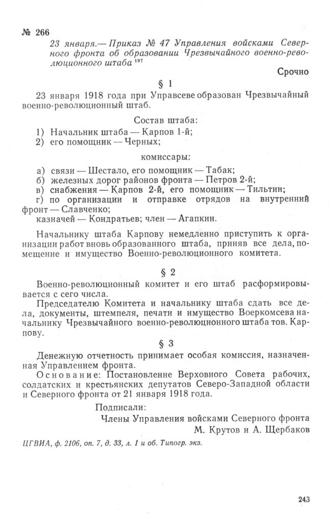 Приказ № 47 Управления войсками Северного фронта об образовании Чрезвычайного военно-революционного штаба. 23 января 1918 г. // ЦГВИА, ф. 2106, оп. 7, д. 33, л. 1 и об. Типогр. экз.