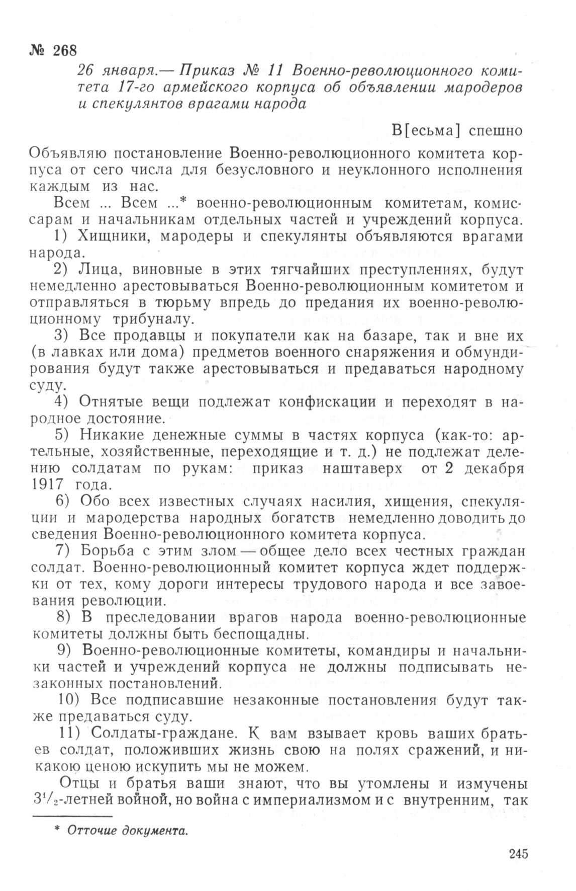 Приказ №11 Военно-революционного комитета 17-го армейского корпуса об объявлении мародеров и спекулянтов врагами народа. 26 января 1918 г. // ЦГВИА, ф. 2333, оп. 1, д. 28, л. 41 и об. Типогр. зкз.