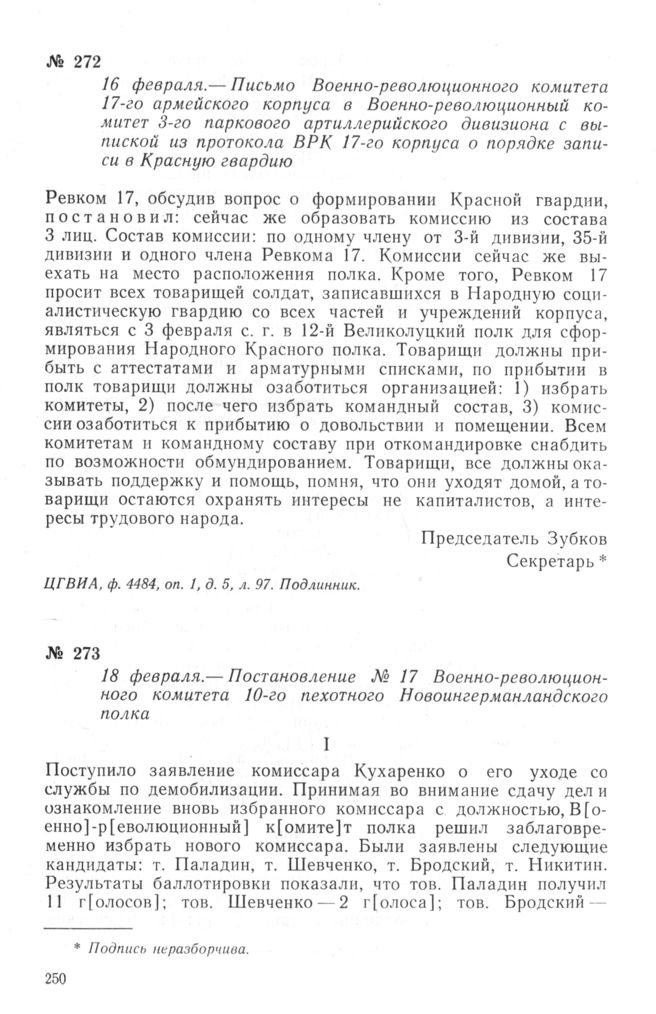 Письмо Военно-революционного комитета 17-го армейского корпуса в Военно-революционный комитет 3-го паркового артиллерийского дивизиона с выпиской из протокола ВРК 17-го корпуса о порядке записи в Красную гвардию. 16 февраля 1918 г. // ЦГВИА, ф. 4484, оп. 1, д. 5, л. 97. Подлинник.