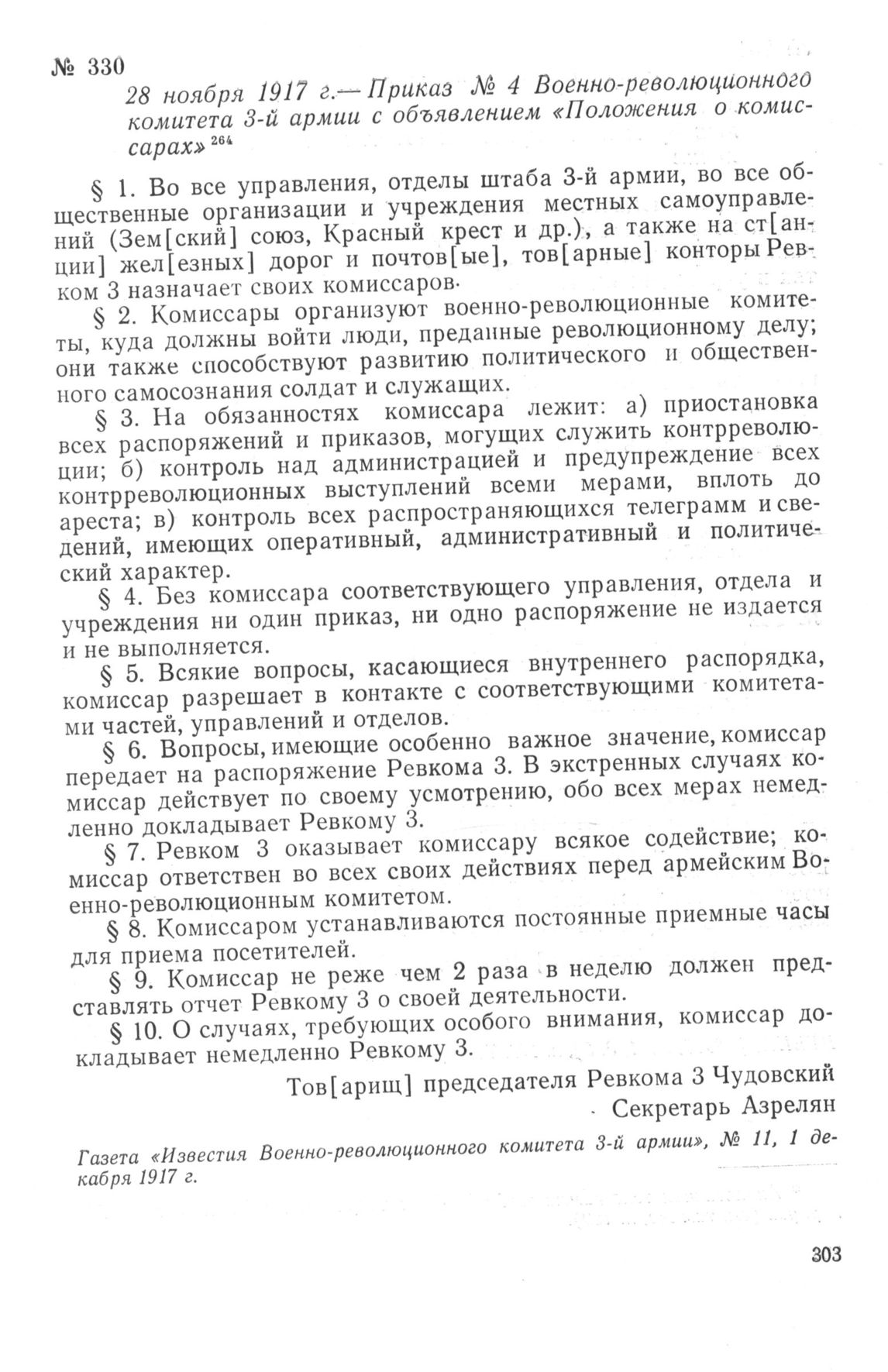 Приказ № 4 Военно-революционного комитета 3-й армии с объявлением «Положения о комиссарах». 28 ноября 1917 г.