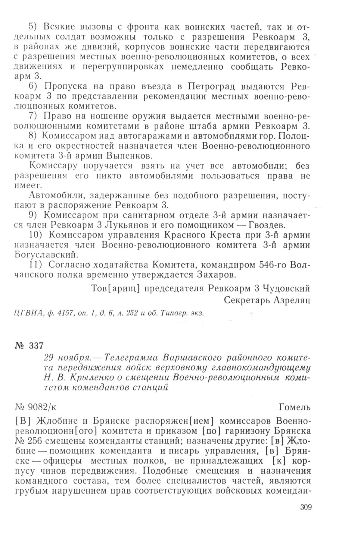 Телеграмма Варшавского районного комитета передвижения войск верховному главнокомандующему Н. В. Крыленко о смещении Военно-революционным комитетом комендантов станций. 29 ноября 1917 г. // ЦГВИА, ф. 2003, оп. 4, д. 40, лл. 65—66. Телегр. лента.
