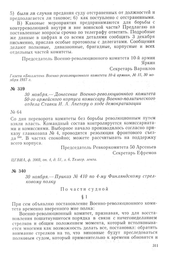 Донесение Военно-революционного комитета 50-го армейского корпуса комиссару Военно-политического отдела Ставки И. А. Апетеру о ходе демократизации. 30 ноября 1917 г. // ЦГВИА, ф. 2003, оп. 4, д. 51, л. 6. Телегр. лента.