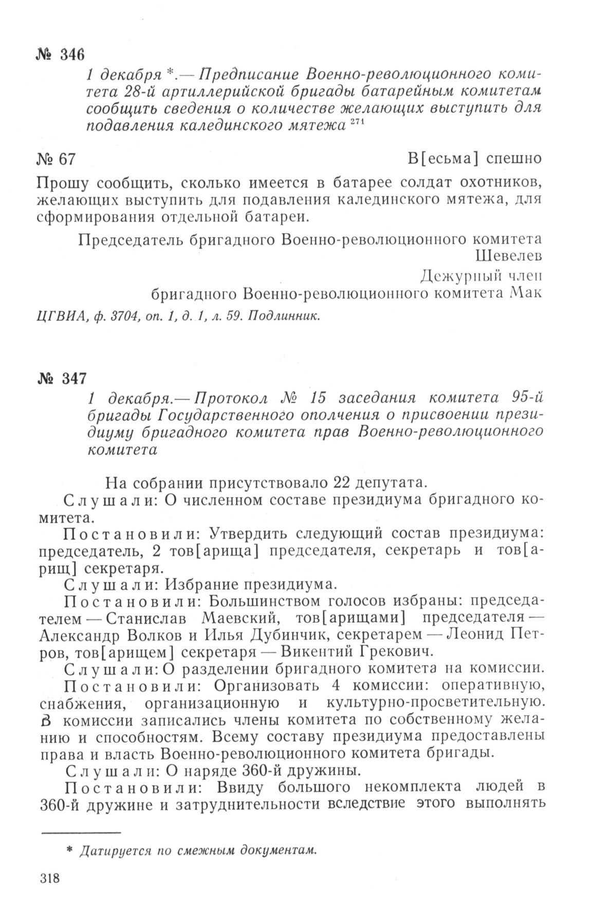 Протокол № 15 заседания комитета 95-й бригады Государственного ополчения о присвоении президиуму бригадного комитета прав Военно-революционного комитета. 1 декабря 1917 г. // ЦГВИА, ф. 8586, оп. 1, д. 2, л. 56. Заверенная копия.